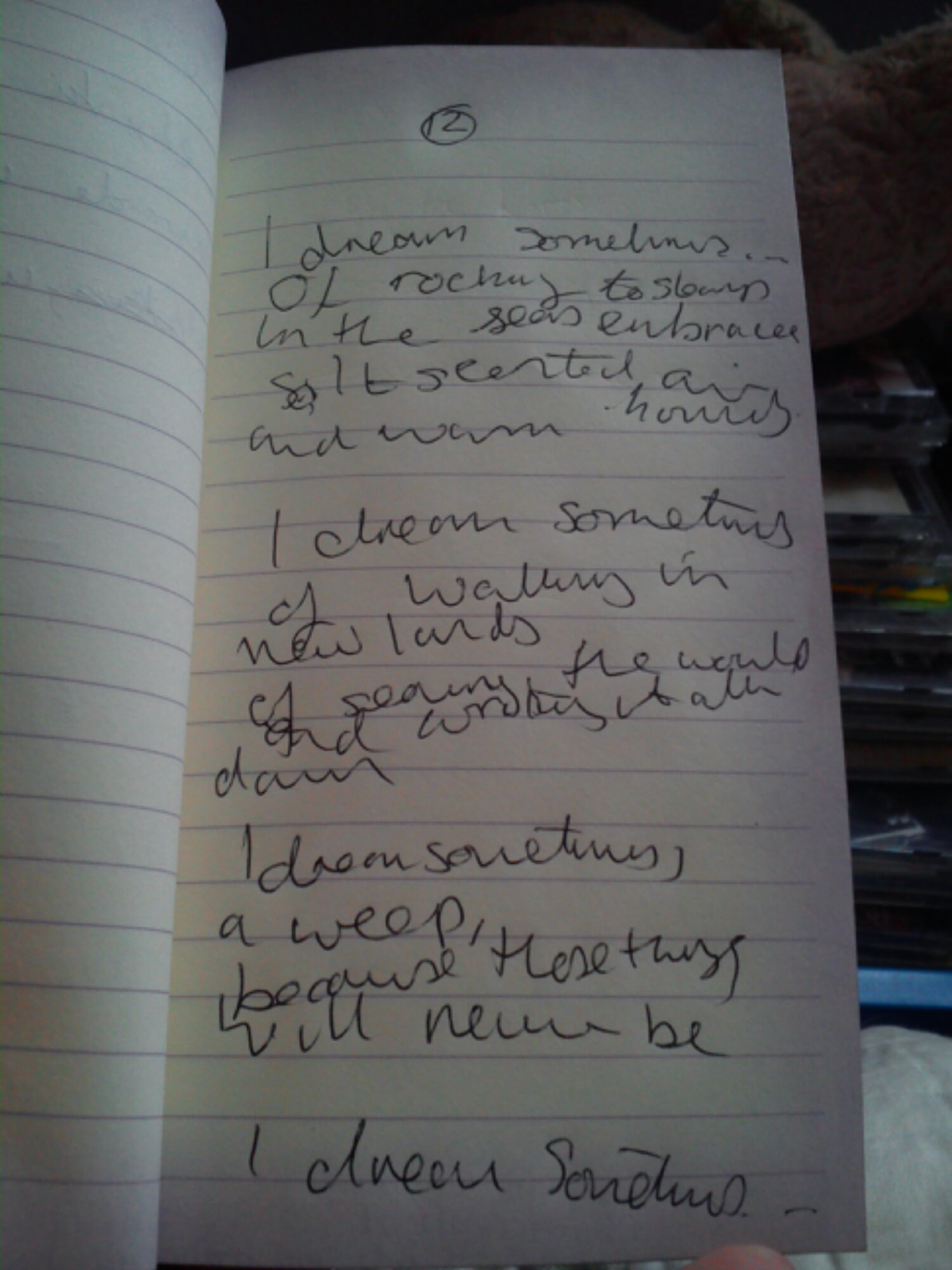 I’m not sure why I chose the particular structure that I used, it just happened to work out that way. I suppose the repetition of the line ‘I dream sometimes’, like the rocking of a small boat in dock, provides a gentle rhythm for the whole. I think the sparse description emphasises the quick contrast between the happy dream and painful reality.