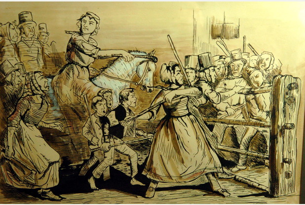 The Welsh ‘Rebecca Riots.’ One of many peasant and worker uprisings in Celtic lands during the 18th and 19th century invoking sovereignty goddesses, land spirits, crones, Fairy Witches, and other mysterious, usually female otherworldly beings. In many of these movements, men wore dresses and bonnets. Other figures invoked included Maeve, Ludd (possibly Llud or Lugh), and Sadhbh.