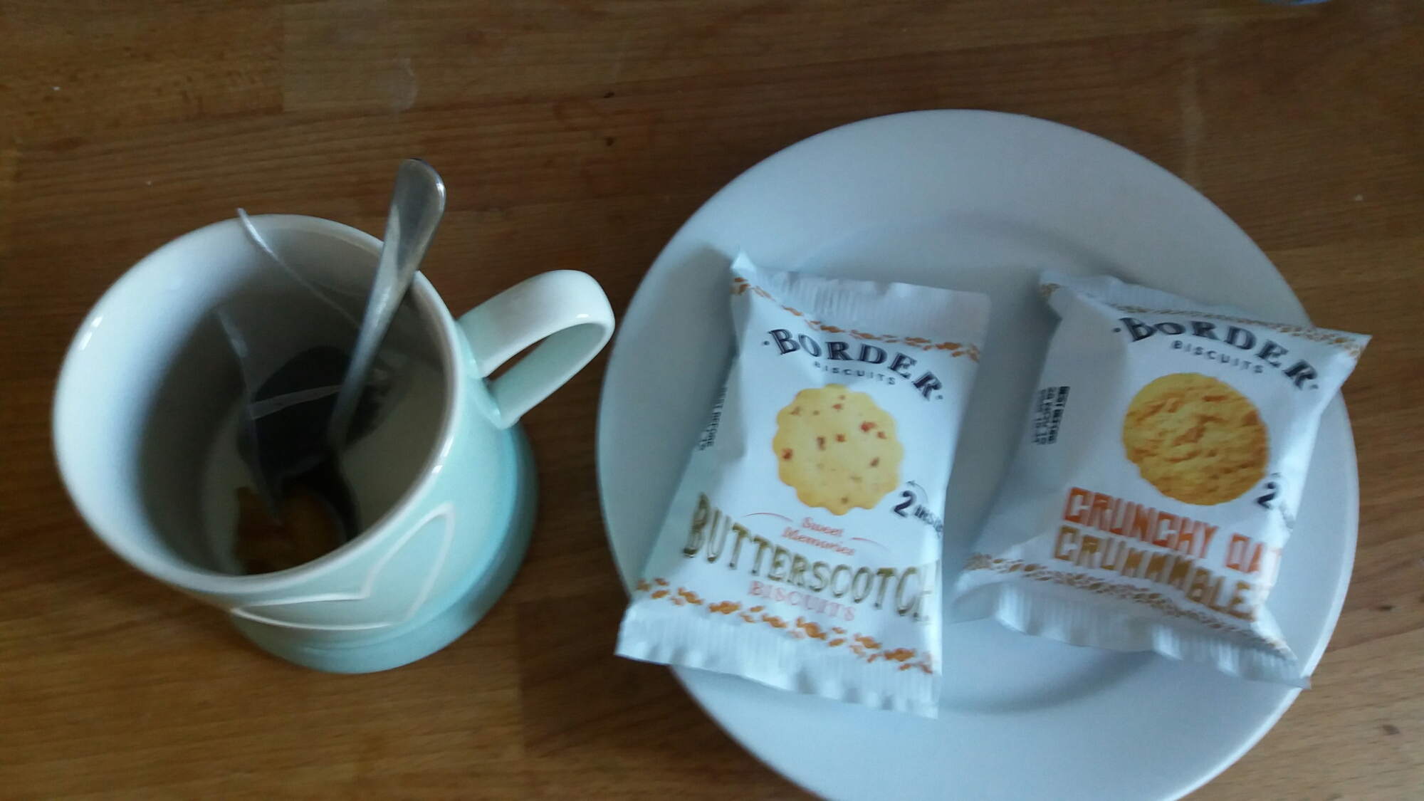 The tea was quite pleasant and fairly strong. I take my tea with a drop of milk and a spoon of honey (sugar of honey unavailable). I couldn’t taste the honey, so it’s a decent strength.
