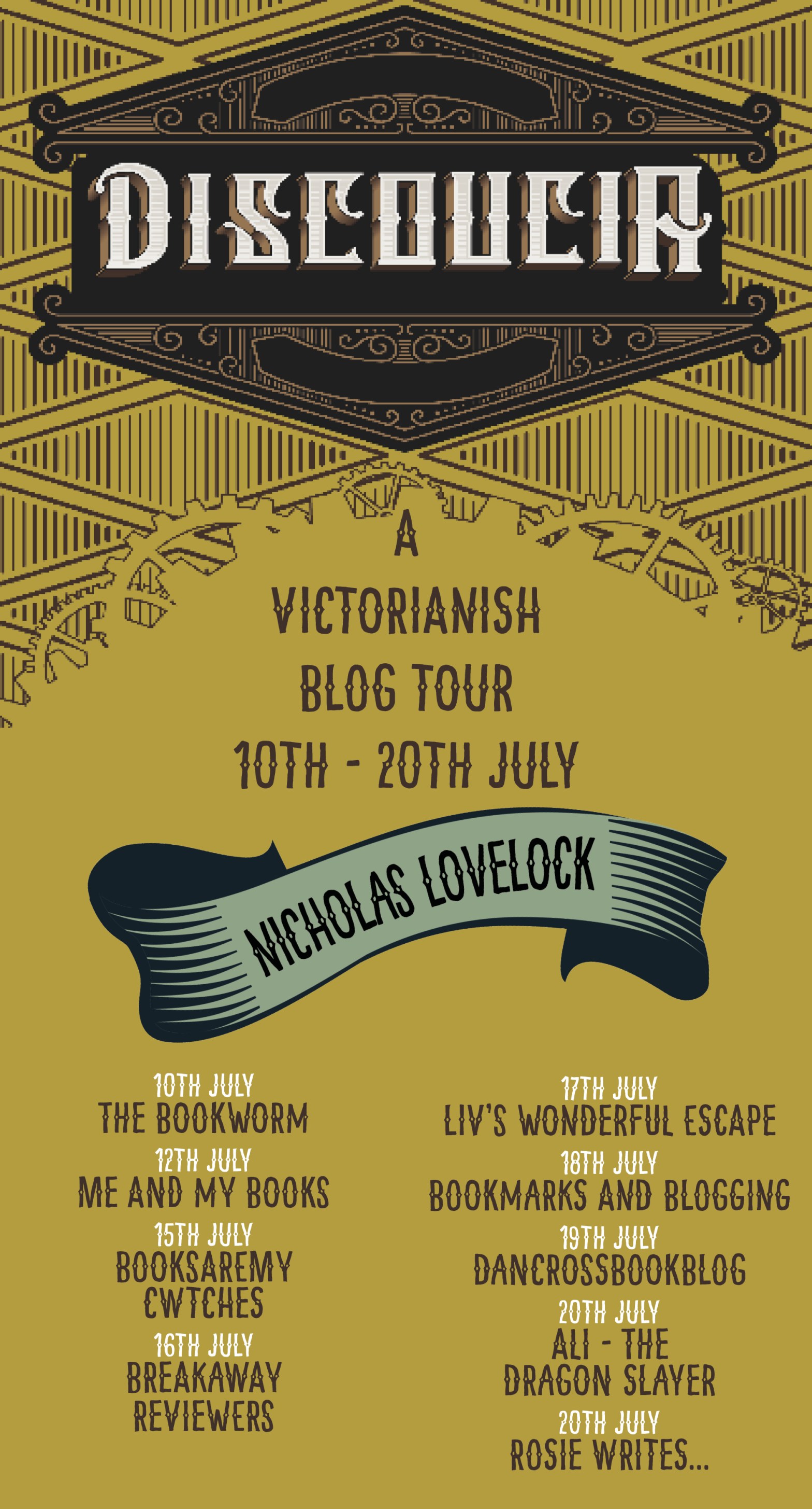 Today, I’m taking part in the blog tour for ‘Discoucia’, by Nicholas Lovelock. It’s a ‘Victorianish fairytale’. As part of the tour, organised by Rachel Gilbey of ‘Authoright’, I have an interview and extract of the book. First the extract.