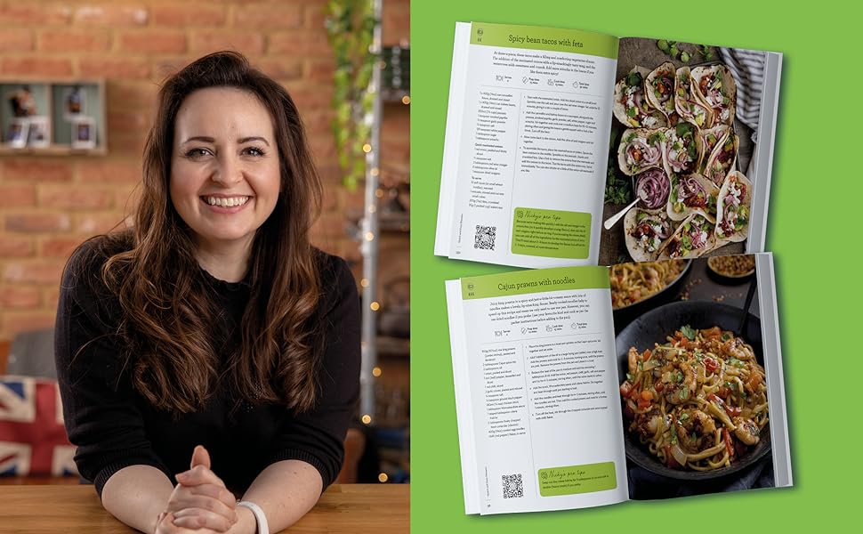 The author makes suggests for shortcuts and ready-prepared ingredients, as well as ingredients you can make at home in advance. There are instructions for safe storage and reheating of batch cooking, as well as flavour enhancers. The recipes have icons showing cost, ingredients, serving size, prep and cooking times. Each comes with a QR code link to a video, as well as written instructions and ingredient list. Each recipe has a pro-tip call out box. It’s really clearly set out and the photography is lovely.